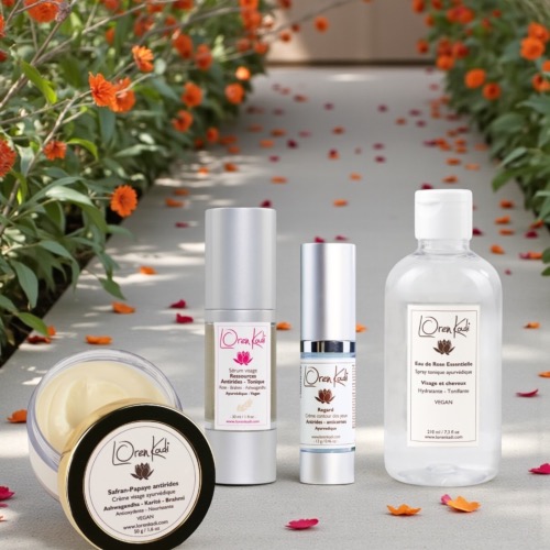 Ce soin anti-âge nourrissant puise ses racines dans la tradition ayurvédique, où chaque plante est choisie pour son rôle dans l'équilibre des doshas et le soin du vivant. Le Safran (Crocus sativus), précieux entre tous, est utilisé depuis des siècles en Inde pour ses vertus régénérantes et lumineuses. La Papaye (Carica papaya) apporte ses enzymes naturelles pour renouveler et protéger la peau. L'Aloevera (Aloe barbadensis) stimule la production de collagène et préserve l'élasticité des tissus. Le Brahmi (Bacopa monnieri) et l'Ashwagandha (Withania somnifera) agissent en profondeur pour revitaliser et raffermir. Le Karité (Butyrospermum parkii) enveloppe la peau d'une nutrition douce et durable, tandis que la Réglisse (Glycyrrhiza glabra) et la Rose (Rosa centifolia) complètent cette alliance végétale pour un teint apaisé et une peau visiblement régénérée.